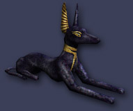 A dark, Lost City style jackal statue. The object has no underside polygons and thus needs to be placed on the floor or on a pedestal.