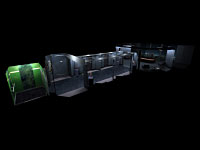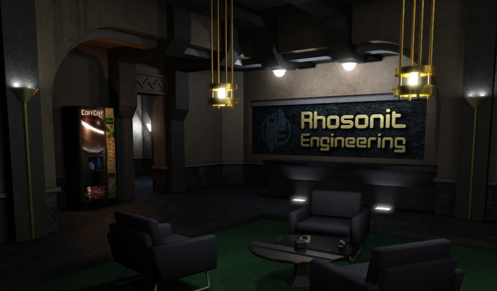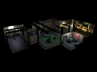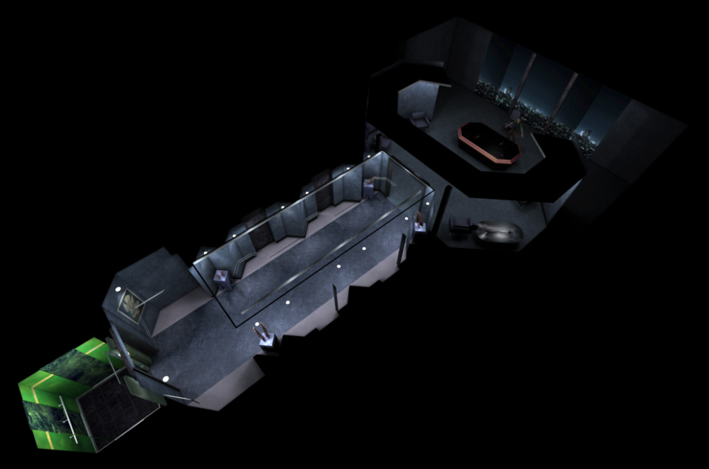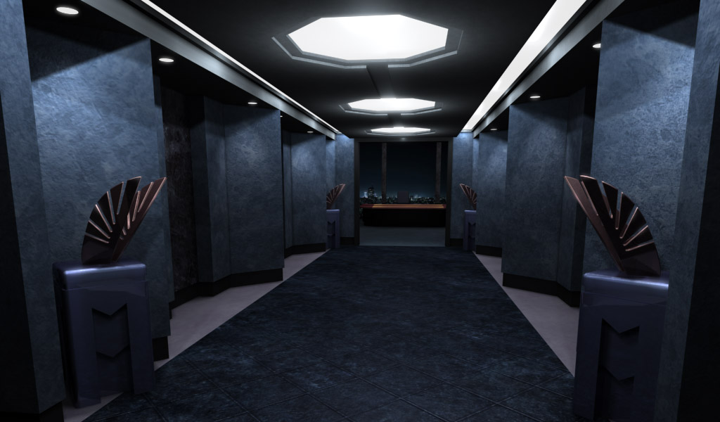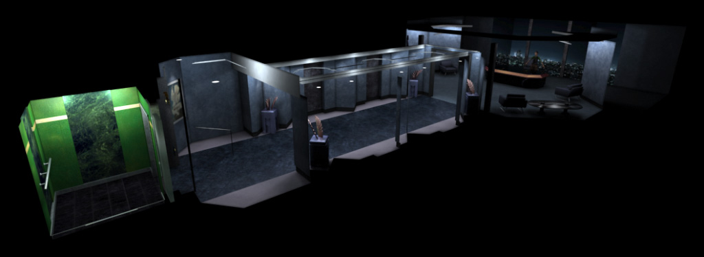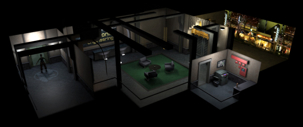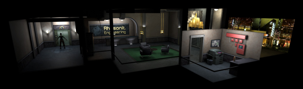 For my 2.5D Adventure Mental Repairs, Inc. I created and rendered the backgrounds in 3ds Max. The game takes place in an office building, and the player can access two floors via elevator. Since there is a crazy computer on the top floor, I took some inspiration from the sci-fi classic Tron for its design (see Dillinger's office).